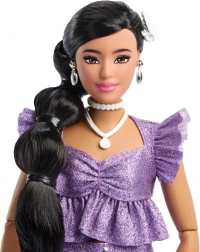 Entdecken Sie die Modewelt mit der Barbie Deluxe Model in glitzerndem violettem Outfit, die auf den ersten Blick begeistert. Dank des gelenkigen Körpers ermöglicht sie natürliche Posen, während zahlreiche Accessoires – von silbernen Sandalen bis zur Handtasche und Schmuck – die Fantasie anregen und eigene Modegeschichten entstehen lassen.