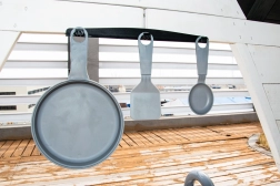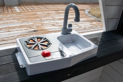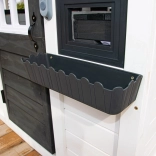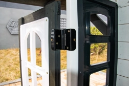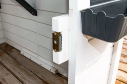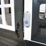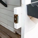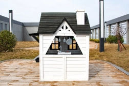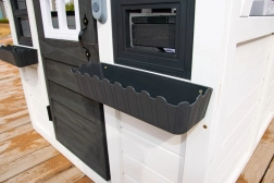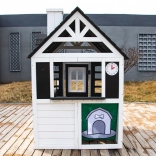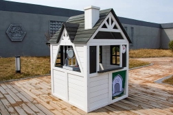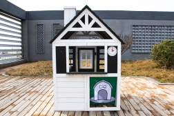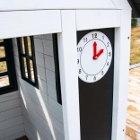 Die Küche, ein Bestandteil des Häuschens, enthält ein Kochfeld mit Drehknopf, ein Spülbecken und grundlegendes Geschirr, sodass die Kinder schmackhafte Menüs für ihre Freunde und Eltern zubereiten können. Weitere Zubehörteile sind eine Uhr, Blumenkästen und ein praktischer Eingang für den Hund, abgedeckt mit einem Stoffvorhang. Die Klingel funktioniert mit 3 LR44-Batterien, die nicht im Lieferumfang enthalten sind, und das Häuschen wird zerlegt mit einer ausführlichen Montageanleitung geliefert.