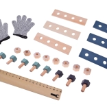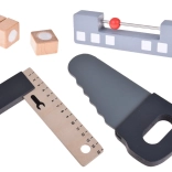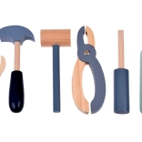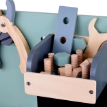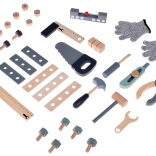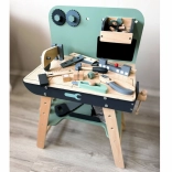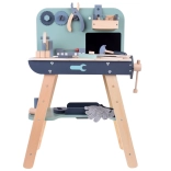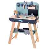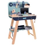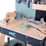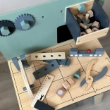 Das Set besteht aus robustem Holz und enthält Werkzeuge wie Hämmer, Schlüssel, Schraubenzieher und mehr. Alle Teile sind sicher, abgerundet und mit viel Liebe zum Detail gefertigt. Der Werkstattbereich ist zusätzlich mit einer kleinen Kreidetafel zur Planung von Projekten ausgestattet.