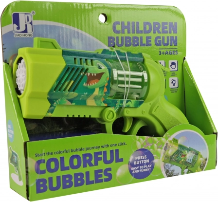 Die lustige Seifenblasenpistole in Dinosaurierform zaubert in Sekunden tausende Blasen. Perfekt zum Spielen draußen und zu Hause, mit Lichteffekt für noch mehr Spaß. Funktioniert mit 4× AA-Batterien (nicht im Lieferumfang enthalten). Einfach die Seifenblasenflüssigkeit in den Behälter füllen und der Spaß kann beginnen.