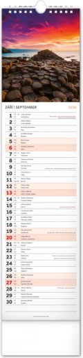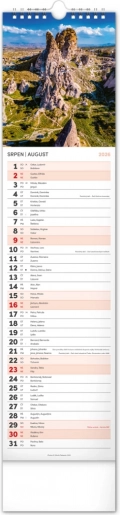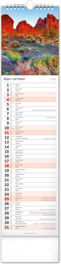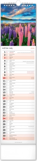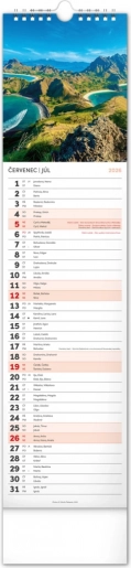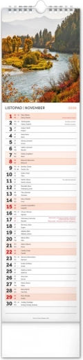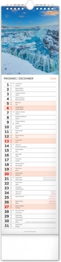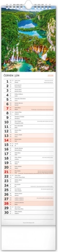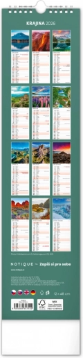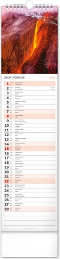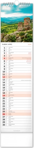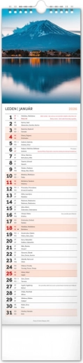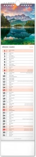Genießen Sie die Schönheit der malerischen Landschaft mit diesem praktischen, schmalen Wandkalender. Enthält tschechische und slowakische Namen, Feiertage, denkwürdige Tage und Mondphasen, mit Platz für Ihre Notizen.