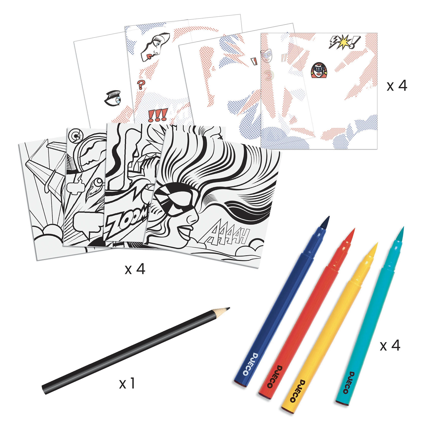 Das DJECO-Set bietet eine wunderbare Gelegenheit, in die Welt des Pop-Art mit einem Hauch von Originalität einzutauchen. Diese kreative Aktivität motiviert junge Talente, den einzigartigen Stil von Roy Lichtenstein zu erkunden und ihre eigene künstlerische Individualität zu entdecken.