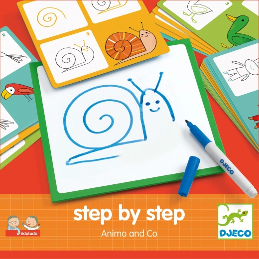 DJECO Schritt für Schritt - Tiere ist ein großartiges Kreativset für Kinder, das ihnen beibringt, beliebte Tiere Schritt für Schritt zu zeichnen. Das Set fördert die Entwicklung der kindlichen Vorstellungskraft und Feinmotorik.