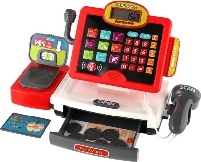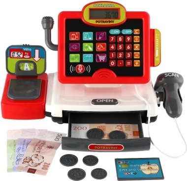 Eine unterhaltsame und lehrreiche elektronische Kinderkasse mit Zubehör für kleine Kaufleute. Enthält einen Scanner mit Licht- und Soundeffekten, Spielgeld-Scheine und -Münzen, einen Kreditkartenschlitz, einen funktionierenden Taschenrechner und eine Waage für Obst und Gemüse. Ideales Spielzeug zur Förderung der Fantasie und der Grundrechenarten.