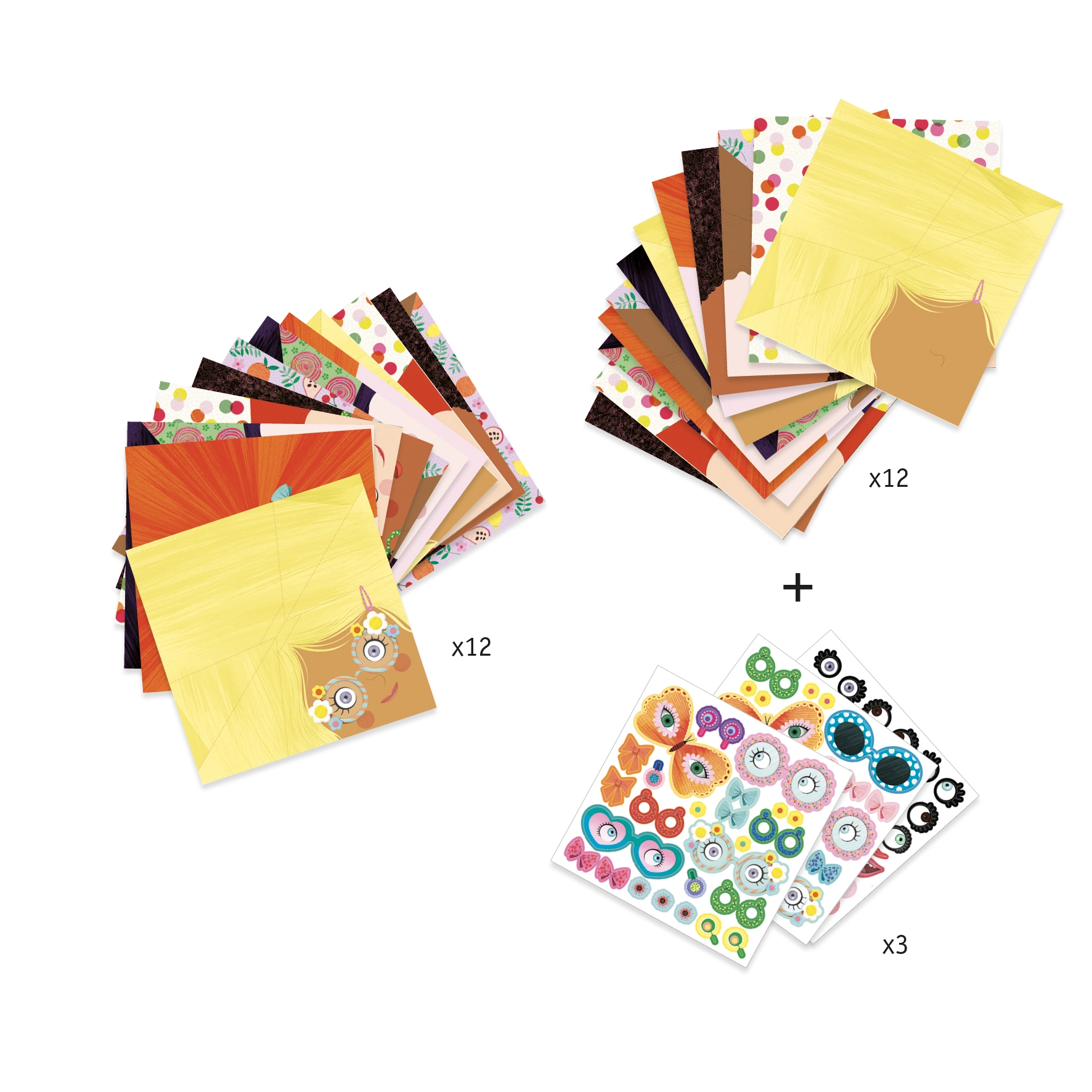 Ein lustiges und kreatives Origami-Set der Marke DJECO, das Kindern ermöglicht, verschiedene Mädchengesichter zu gestalten und ihre handwerklichen Fähigkeiten zu entwickeln.