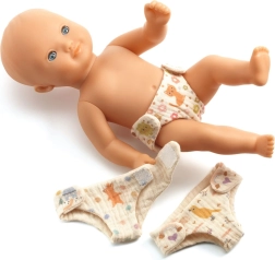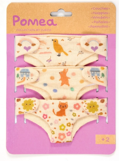 Das Set enthält drei Windeln mit verschiedenen niedlichen Motiven, die jedes Pflegespiel bereichern.