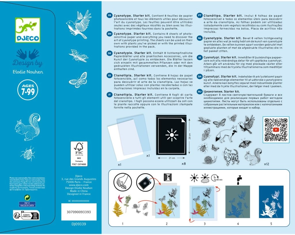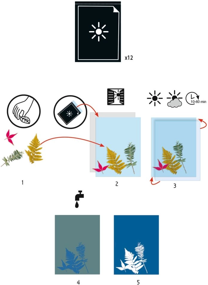 Das Cyanotypie-Set von Djeco bietet eine einfache Möglichkeit, eindrucksvolle Bilder mithilfe von Sonnenlicht zu gestalten. Legen Sie die gedruckten Motive auf das lichtempfindliche Papier, bedecken Sie sie mit Plexiglas, belichten Sie kurz und nach dem Abspülen mit Wasser erscheint die Szene auf dem ikonischen blauen Hintergrund. Das Ergebnis ist stets überraschend und schön.