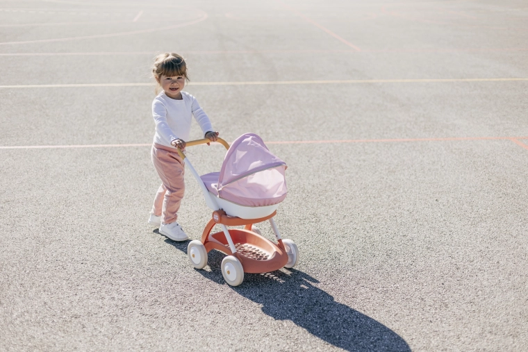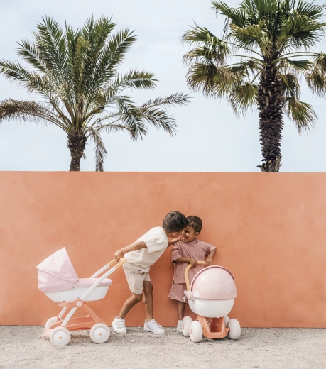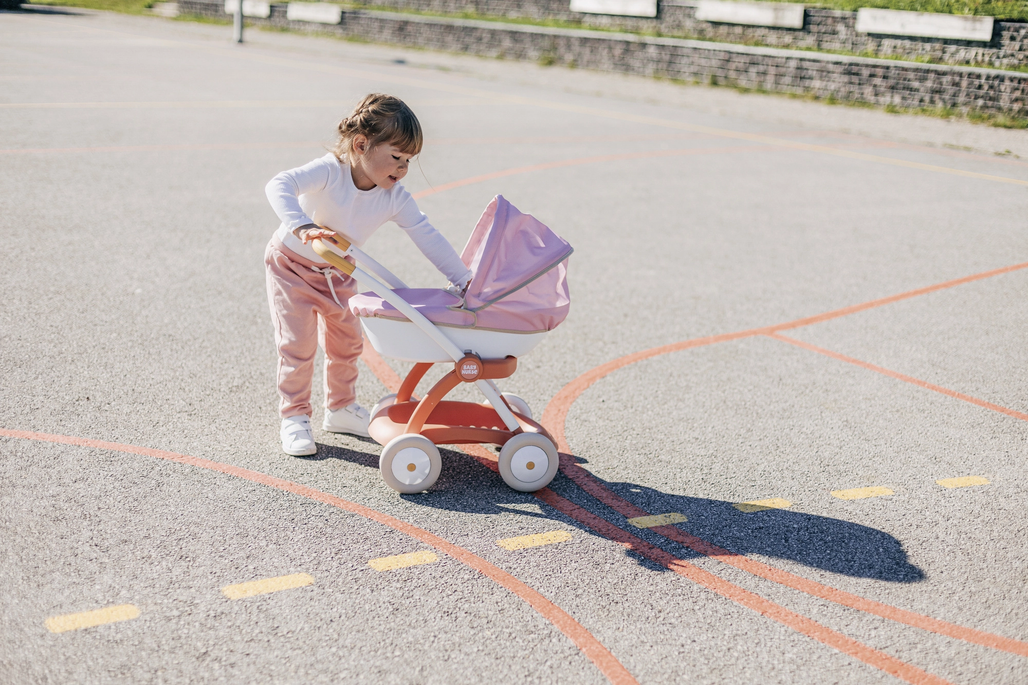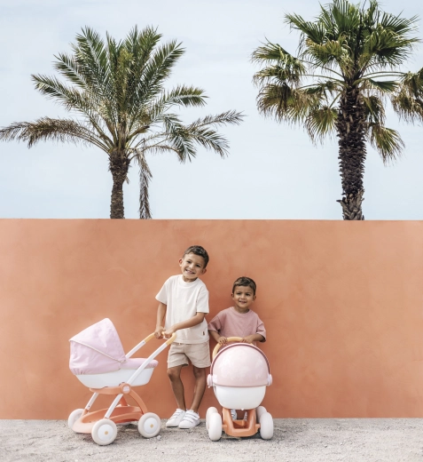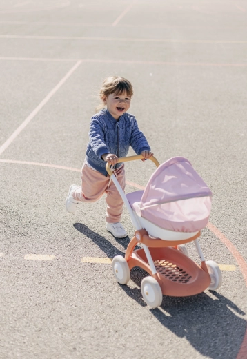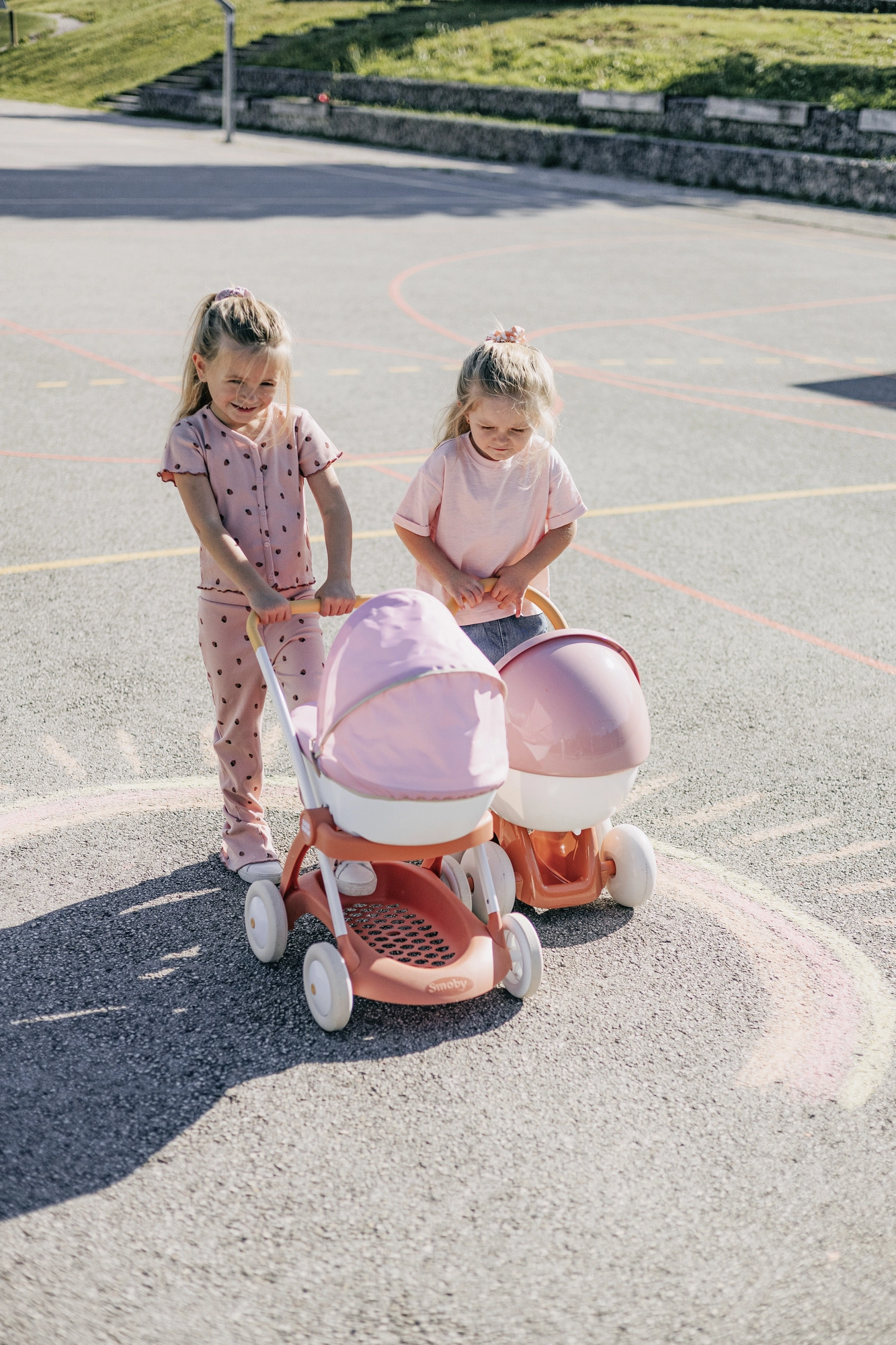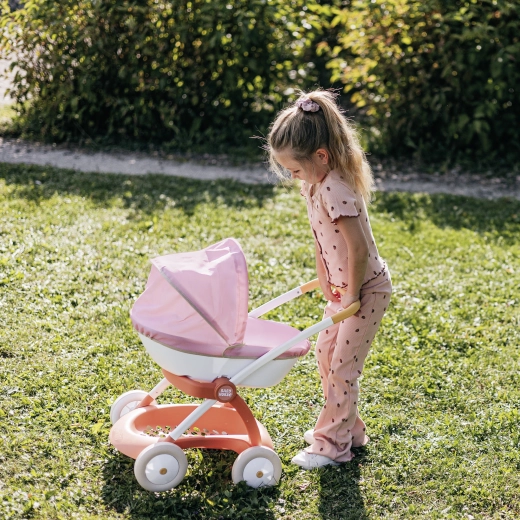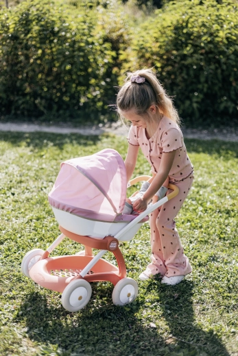 Der Puppenwagen Smoby Baby Nurse in Rosa-Apricot-Weiß ist wie gemacht für tägliche Spaziergänge mit der Lieblingspuppe. Dank des Metallrahmens und der leisen Räder ist die Fahrt sanft und stabil, während der ergonomische Griff auch jüngeren Kindern die Führung erleichtert.