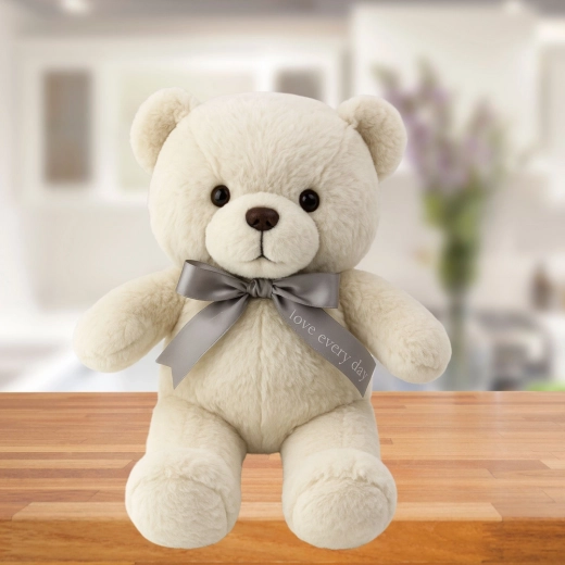 Das auffälligste Merkmal des Bären ist die silberne Satinschleife mit dem Aufdruck "Happy every day", die dem Spielzeug ein besonderes und elegantes Aussehen verleiht. Der Bär hat einen rundlichen Kopf, freundliche Augen und breite Pfoten, was beim Kind ein Gefühl von Sicherheit und Nähe hervorruft. Dank seiner passenden Größe ist der Bär leicht, einfach zu tragen und ideal zum Kuscheln.