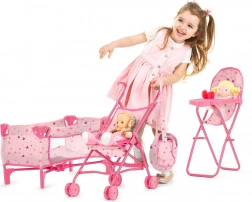 Das Chipolino Puppenset Trixy 3-in-1 bietet eine vollständige Lösung für kleine Betreuerinnen. Das Set enthält einen Buggy, einen Hochstuhl, ein Bettchen, eine Windeltasche und eine Tragetasche. Alle Komponenten sind so gestaltet, dass sie leicht und faltbar sind, was das Tragen und Lagern erleichtert: