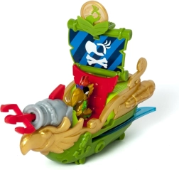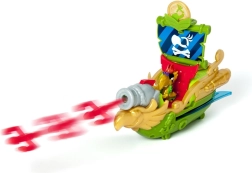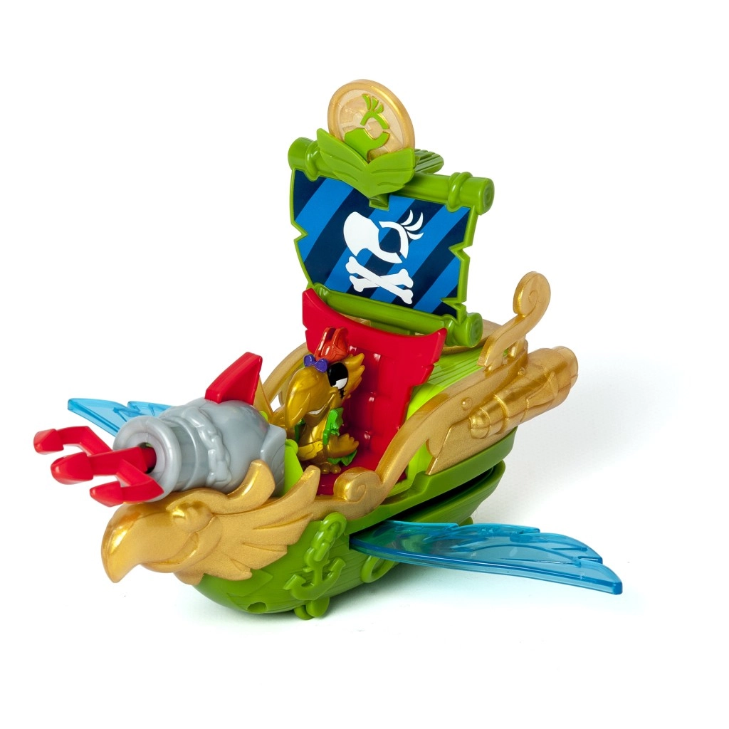 Dieses Schiff hat Details wie einen Totenkopf und gekreuzte Knochen sowie einen Vogel auf dem Bug. Es ist für fantasievolles Spielen mit rotierenden Mechanismen ausgelegt.