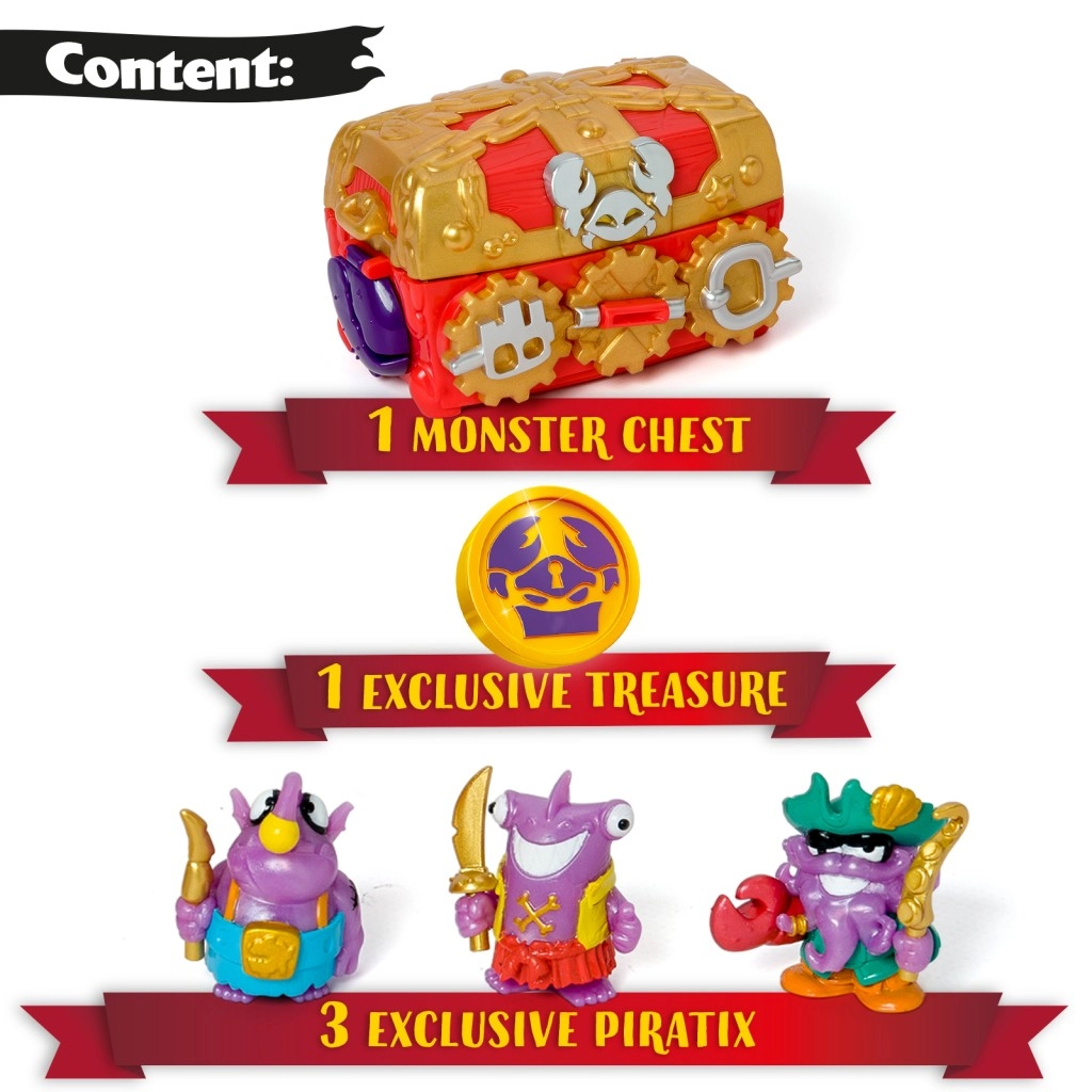 1 Monster-Schatztruhe, 3 exklusive Piratixen, 1 exklusive Schatzmünze, 3 Zubehörteile