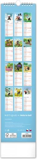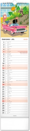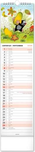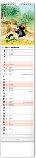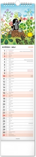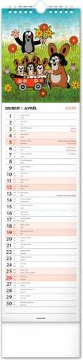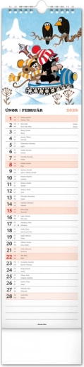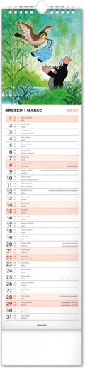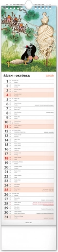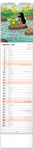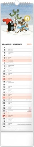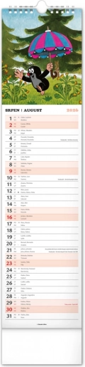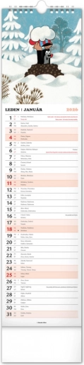 Attraktiver Wandkalender mit Illustrationen von Zdeněk Miler und einem praktischen krawattenförmigen Format. Der Kalender umfasst tschechisches und slowakisches Kalendarium mit Namen, Feiertagen, Gedenktagen und Mondphasen.