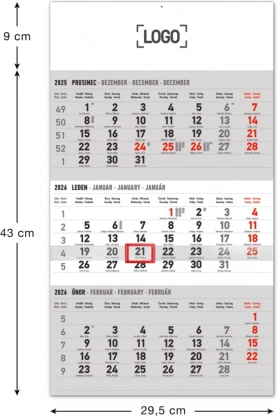 Behalten Sie das ganze Jahr 2026 den Überblick mit diesem eleganten Wandkalender. Das Dreimonatslayout zeigt den vergangenen, aktuellen und folgenden Monat gleichzeitig an – so wird die Planung schnell und intuitiv. Der graue Hintergrund sorgt für hervorragende Lesbarkeit und wirkt sowohl im Büro als auch zu Hause professionell.