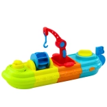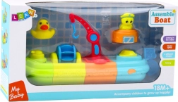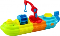 Das Boot besteht aus vier bunten Modulen, die eine große Baugruppe bilden. An Bord befinden sich lustige Passagierfiguren – eine Ente und eine Schildkröte – sowie viele bewegliche Teile wie ein Kran mit Haken, ein Wassermühlrad und eine Wasserkanone. Die Ente kann Wasser spritzen, was jedes Kind sicher zum Lachen bringen wird. Weitere Gefäße ermöglichen das Übergießen von Wasser, was das Spiel bereichert und die sensorische Entwicklung fördert.