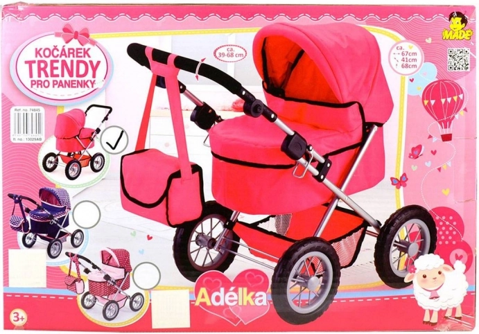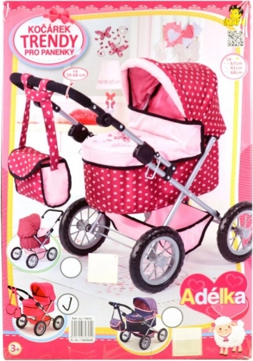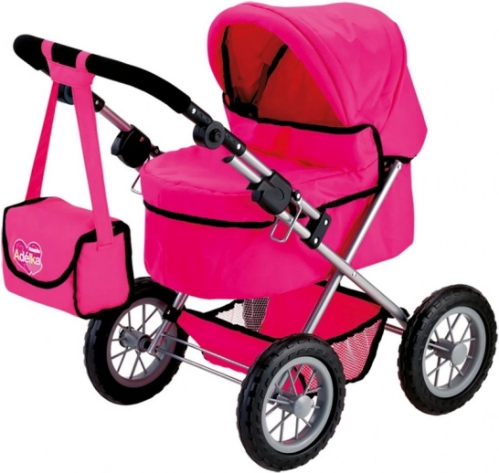 Tiefer Puppenwagen im modernen Design in rosa Farbe, ideal für Puppen bis 42 cm, inklusive Puppe Adélka. Leicht faltbar und entfaltbar für bequeme Ausflüge.