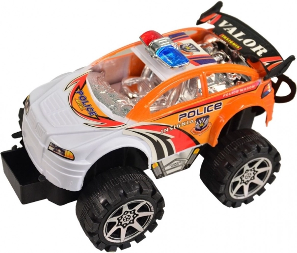 Polizeigeländewagen, das ideale Spielzeug für kleine Abenteurer. Es zeichnet sich durch sein Kunststoffmaterial und seine großen Räder aus, die auch unebenes Gelände meistern.