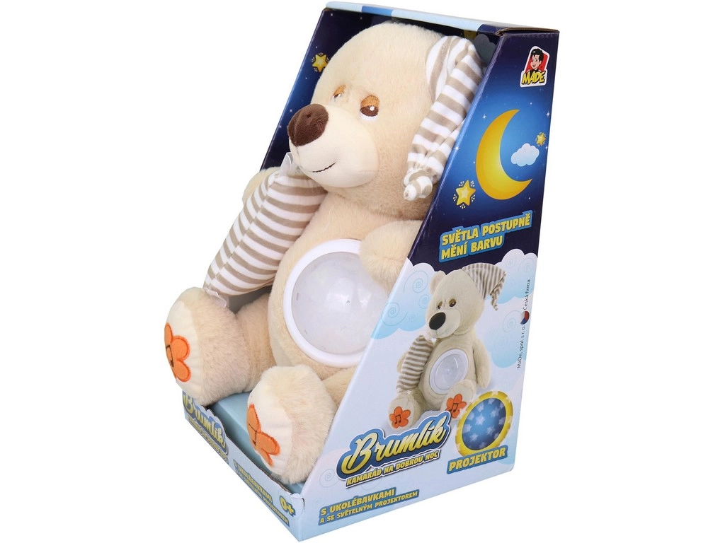 MaDe Teddybär Brumlík ist der perfekte Begleiter für eine gute Nacht für die Kleinen. Mit Wiegenliedern und Projektor hilft er Ihrem Kind leichter einzuschlafen.