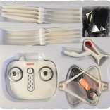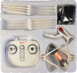 Paket beinhaltet: Drohne, Fernbedienung, Anleitung, Schraubendreher, Kartenleser, Propeller, Kamera, Handyhalterung, Schutzrahmen, Ladegerät und Schlüssel.