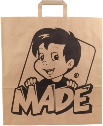 Diese stilvolle Papiertüte MaDe® mit den Maßen 450x170x480 mm ist aus sehr robustem und umweltfreundlichem Papier hergestellt, was ein einfaches Tragen auch schwererer Einkäufe wie Spielzeuge ermöglicht.