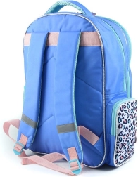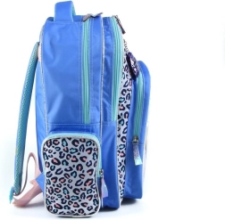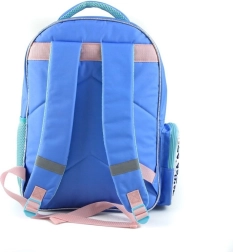 Der Rucksack ist in dominierenden Blau-Violett-Tönen und niedlichen Mustern gestaltet, was ihn zu einem verspielten und beliebten Accessoire für Kinder macht.