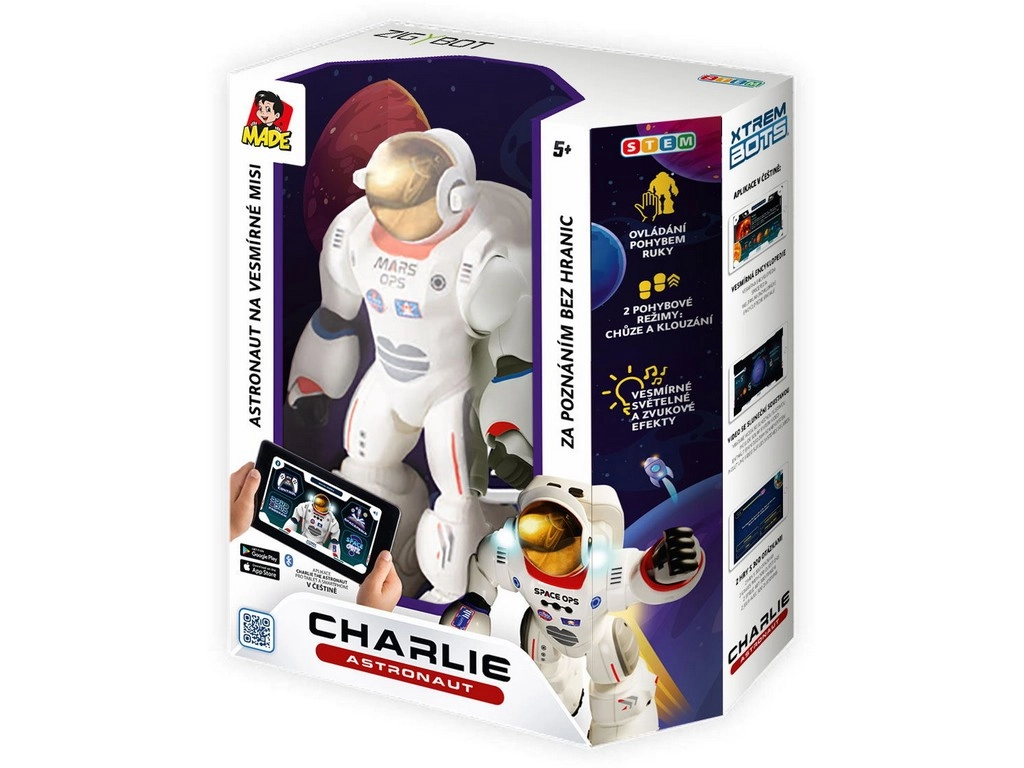 Mit der Lehranwendung kann man bis zu 200 Bewegungen programmieren und Optionen wie Kosmopedia oder das unterhaltsame Weltraum-Quiz genießen, das dein Wissen über den Weltraum testet. Charlie ist zudem mit Licht- und Soundeffekten ausgestattet, die seinen realistischen Eindruck verstärken. Hergestellt aus robustem Kunststoff und betrieben mit drei 1,5V AA-Batterien, ist er bereit für jedes Weltraumabenteuer. Das tschechische Design der Verpackung und die mehrsprachige App, einschließlich Tschechisch, sorgen dafür, dass der Roboter eine großartige Wahl für jeden ist, der Spaß haben und gleichzeitig lernen möchte!