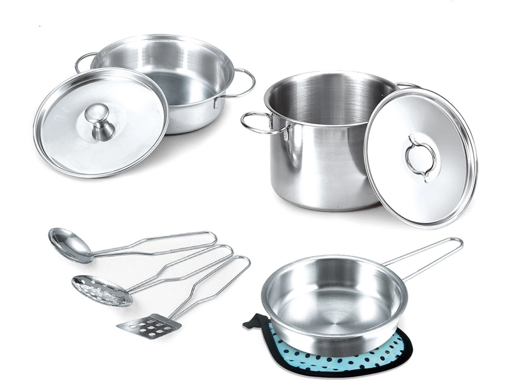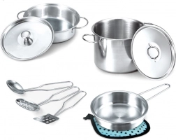 Dieses Set aus Edelstahlgeschirr für Kinder mit neun Teilen ist ideal für kleine Köchinnen und Köche. Geeignet für Kinder ab 3 Jahren.