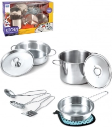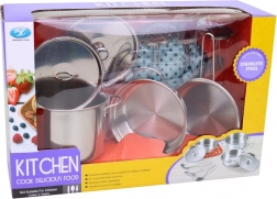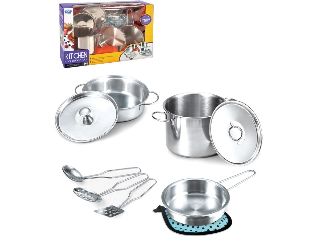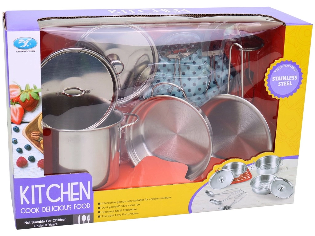 Dieses Edelstahlgeschirrset umfasst neun Teile, die die Möglichkeiten von Kinderküchenspielen erweitern. Zeigen Sie Ihren Kindern, wie man mit diesem großartigen Set kocht. Das Geschirr ist aus Blech gefertigt, was es sicher und langlebig für Kinderspiele macht. Die Geschenkverpackung im Fensterbox-Stil sorgt dafür, dass das Set schon auf den ersten Blick hervorragend aussieht.