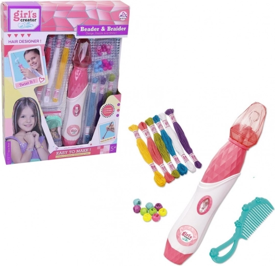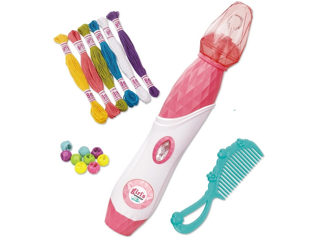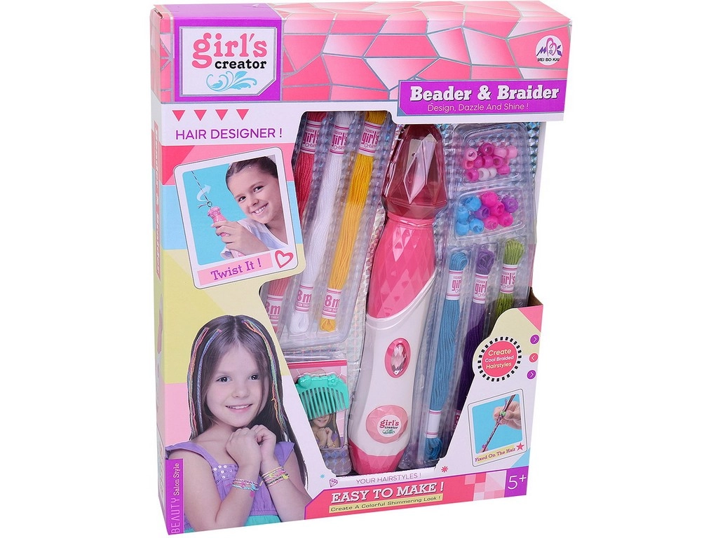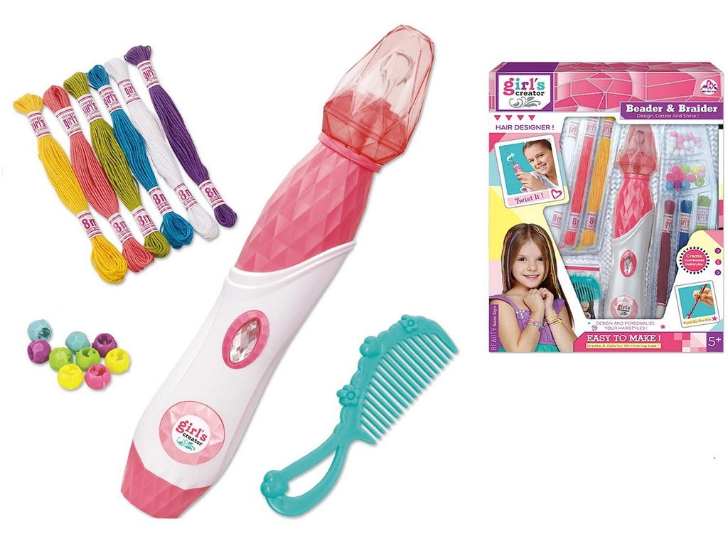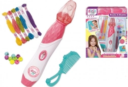 Dieses Perlen-Stylingset für Haare enthält alles, was Ihr Kind benötigt, um originelle Frisuren zu kreieren. Die Anwendung ist einfach – die Fäden werden an den Haaren befestigt und mithilfe des Diamantknopfs wird die Haarsträhne verdreht. Anschließend wird das Ende der Strähne einfach mit einer Perle gesichert, und die neue Frisur ist fertig.