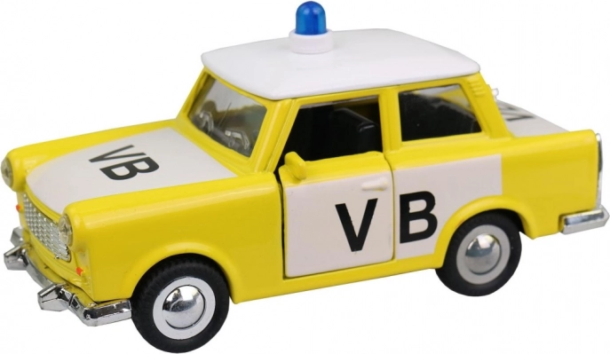 Auto Trabant in Polizei-Version ist ein kleines Metallmodell, ideal für kleine Jungs, die adrenalingeladene Spiele mit Polizeiautos lieben.