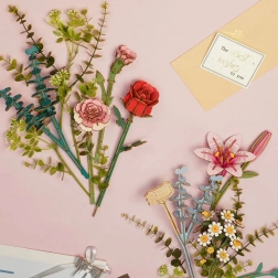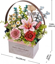 Die Packung enthält alle benötigten Teile: Holzkörbchen, rosa Lilie, rote Rose, Kamille, rosa Nelke, Eukalyptus und dekorative Pflanzen. Dieses Set wird unmontiert mit einer detaillierten Montageanleitung geliefert.