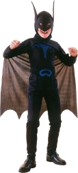 Gönnen Sie Ihrem Kind ein Kostüm BAT, mit dem es der Star jeder Veranstaltung wird. Dieses Kostüm ist für Jungen im Alter von 9-12 Jahren gedacht und enthält einen Overall, einen Umhang mit Kapuze und Maske sowie einen Gürtel. Leider sind Hosen und Schuhe nicht im Lieferumfang enthalten.
