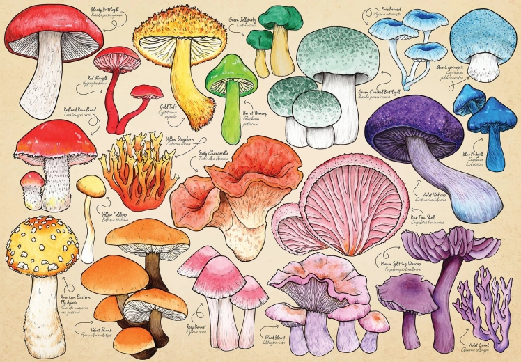 Dank der Namen der Pilze in englischer und lateinischer Sprache bietet das Puzzle auch ein edukatives Element. Das fertige Bild hat eine Größe von etwa 69 x 48 cm.