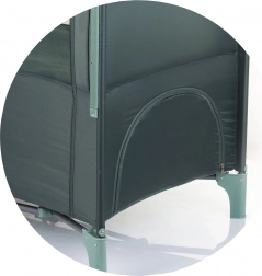 Es ist mit zwei Rädern mit Bremse für einfaches Verschieben ausgestattet. Außerdem lässt es sich einfach zusammen- und auseinanderklappen, was eine schnelle Reisevorbereitung gewährleistet. Das Set enthält ein klappbares Bett, eine Matratze, eine zweite Bettschicht und eine praktische Tasche zum Transport und zur Aufbewahrung.