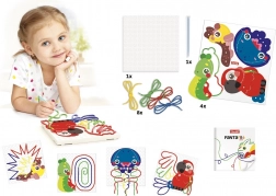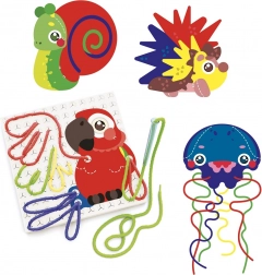 Das Set enthält vier Tierformen aus Karton (z. B. Papagei, Igel, Schnecke, Qualle) und acht farbige Schnürsenkel, die zu kreativem Gestalten und Kombinieren von Mustern anregen.