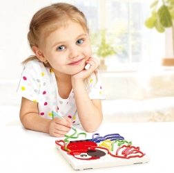 Der spezielle Fädelstift ermöglicht es Kindern, die Schnur sicher und bequem durch die Löcher der Platte zu führen. Nach dem Herausziehen des Stifts hält das Loch die Schnur fest, sodass die Muster ihre Form behalten.