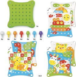 Im Set enthalten sind eine Kunststoffbasis, drei beidseitig illustrierte Karten und insgesamt 40 bunte Stecker. Kinder können nach Vorlagen legen oder eigene Bilder gestalten – ein Spielspaß, der mit ihnen mitwächst.