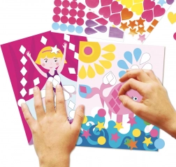 Das Set besteht aus 10 vorgedruckten Bildern (21 × 17 cm) und 5 Stickerbögen mit Motiven wie Fee, Prinzessin, Pony, Einhorn und mehr. Eine praktische Hülle dient auch als Aufbewahrungsort für weiteres Gestalten.
