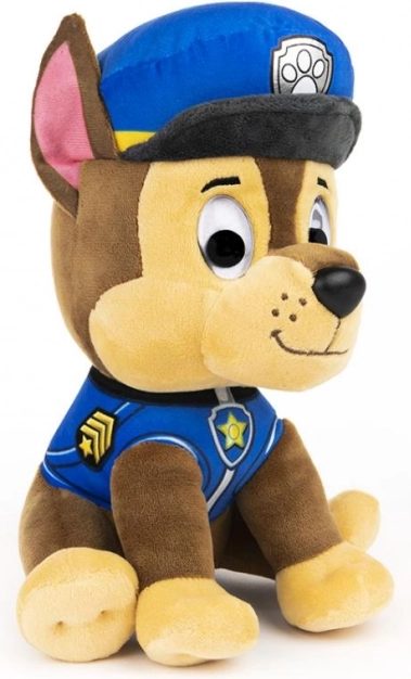 Der plüschige Hund Chase aus der Serie Paw Patrol ist etwa 23 cm hoch und trägt die charakteristische blaue Uniform mit Mütze und Abzeichen. Das sorgfältig gestaltete Design einschließlich des Gesichtsausdrucks unterstützt kreatives Spielen und fördert die kindliche Vorstellungskraft.