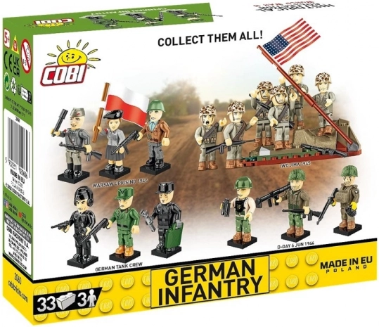 Die deutsche Infanterie während des Zweiten Weltkrieges war die Basiskraft der Wehrmacht, verantwortlich für die Einnahme von Städten, die Verteidigung von Positionen und Kampfoperationen im Gelände. Unser Set enthält drei Figuren, die zwei Infanteristen und einen Gebirgsjäger darstellen, jeder mit einem Karabiner Mauser Kar98k. Die Figuren sind detailreich ausgearbeitet mit einem starken Fokus auf Authentizität.