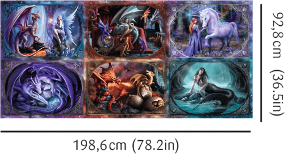 Die Verpackung enthält sechs separate Beutel mit jeweils 1500 Teilen und eine Papier-Vorlage im Format 67x45 cm. Die Größe des zusammengesetzten Puzzles beträgt 198,6 x 92,8 cm.