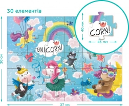 Genießen Sie das Zusammensetzen eines Puzzles mit magischen Einhörnern und begeben Sie sich auf ein Abenteuer voller Fantasie. Das Set enthält 30 Teile, die ein Bild von ca. 27 x 20 cm ergeben.
