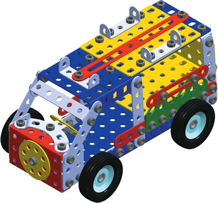 Der Bausatz enthält ein Anleitungsbuch, das Sie Schritt für Schritt durch den Bau von 30 Modellen wie Bandsäge, Kran, Lastwagen oder Wagen führt. Auf den Einführungsseiten finden Sie grundlegende Ratschläge zur Verbindung von Teilen, Verwendung von Kontermuttern und anderen Techniken, die fürs Modellieren notwendig sind.