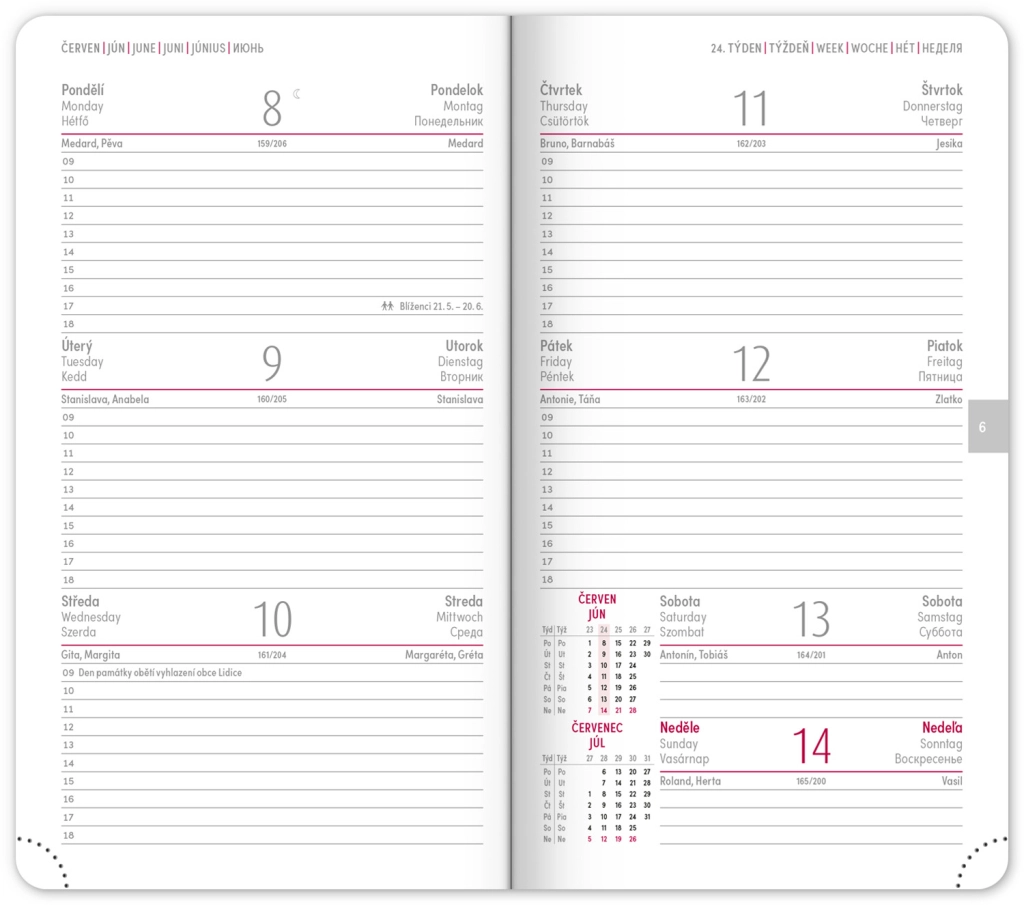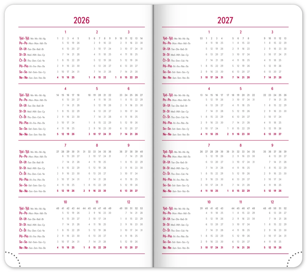Dieser Kalender ist für maximalen Komfort und Praktikabilität entworfen. Er enthält einen Wochenplan mit einem tschechisch-slowakischen Kalendarium und zusätzlichen Sprachen wie Englisch, Deutsch, Ungarisch und Russisch. Genießen Sie das Kalendarium ab Dezember 2025 und vieles mehr.