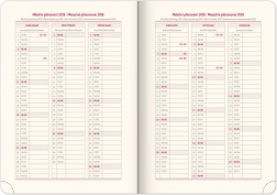Wöchentlicher Planner Diamante 2026 in eleganter roter Farbe mit einer Oberfläche, die an einen Diamantschliff erinnert. Ideal für Prägungen, enthält abgerundete Ecken, einen Stifthalter und ein elastisches Band, mit einem Zeitplan im tschechisch-slowakischen Kalender.