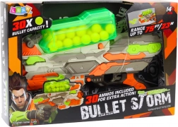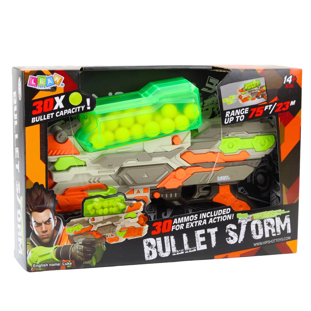 Die Pistole Bullet Storm ist als futuristische Waffe mit aggressivem Design und auffälligen Farben gestaltet, inspiriert von der Spielewelt und Science-Fiction. Dank des großen Magazins mit einer Kapazität von 30 Kugeln und einer Reichweite bis zu 23 Metern sorgt sie für aufregenden und actionreichen Spaß, egal ob draußen oder drinnen.