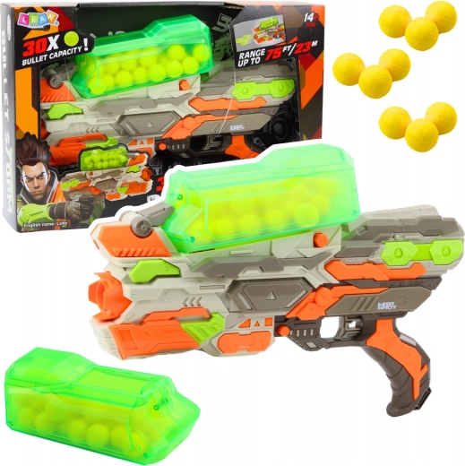 Sie schießt leichte Schaumstoffkugeln mit großer Kraft, was sie zu einer idealen Wahl für sichere Spiele im Freien oder in sorgfältig vorbereiteten Innenräumen macht. Das durchsichtige Magazin ermöglicht eine schnelle Kontrolle der verbleibenden Kugeln.