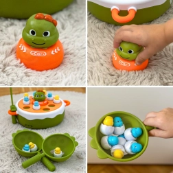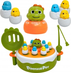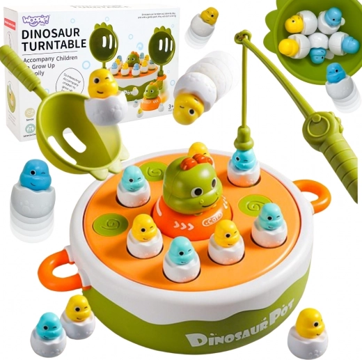Die Spielbasis mit Griffen ist kompakt und bereit für schnelle Action: Kinder können die Dino-Küken mit der Magnetangel angeln oder sie katapultieren und mit Schaufeln fangen. Auf der anderen Seite der Basis finden sie Tic-Tac-Toe für einen ruhigeren Wettbewerb, und der große, niedliche Dinosaurier–Auto bringt eine weitere Dimension fantasievollen Spiels.