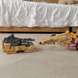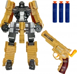 Lieferumfang: 1× Transformations-Roboter/Panzer, 1× Pistole (Revolver), 3× Schaumstoffpfeil, zusätzliches Kampfzubehör.