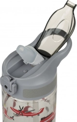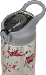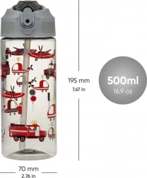 Durchsichtige Plastikflasche mit Bildern roter Feuerwehrautos und Hubschrauber, ideal für Spaß bei jedem Schluck.